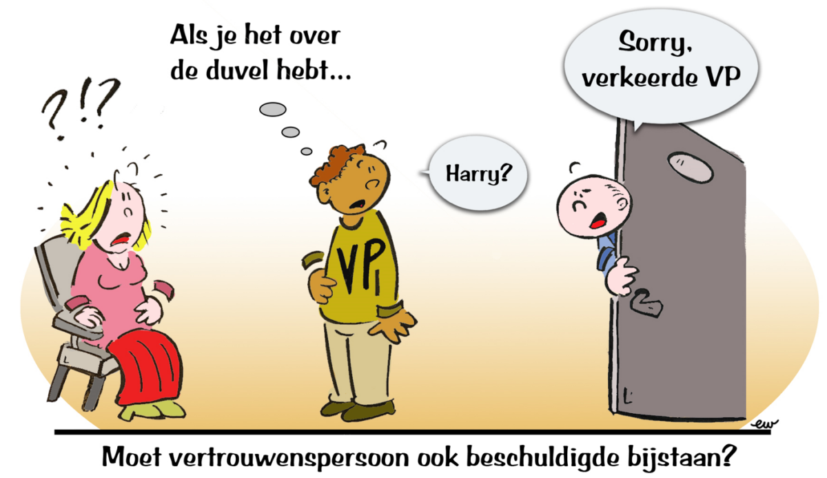 Mo zei dat dit veranderd was en in de afgelopen nieuwsbrief van de LVV ook een opiniestuk stond dat beschuldigden bij de vertrouwenspersoon terecht moeten kunnen. Mo deelde deze opvatting: “Ook iemand die beschuldigd is, heeft recht op veiligheid en iemand die naast hem staat. Daarnaast rekent de directeur op ons, dus ik stuur hem naar jou door!” Ik heb deze misvatting meteen gecorrigeerd. Dat is NIET wat in de opinie staat.